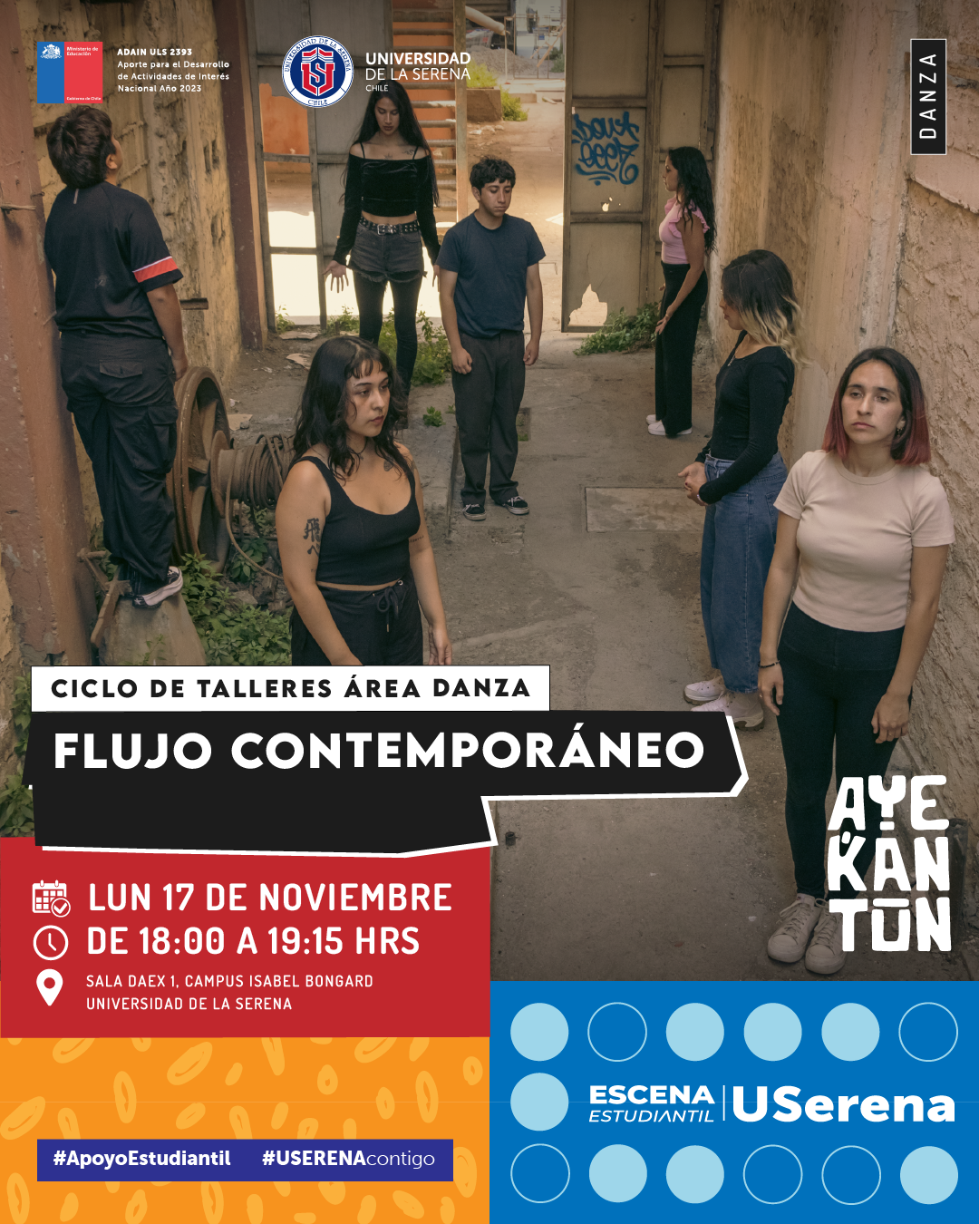 ✨ El Ciclo de Talleres del Área Danza llega a su última sesión junto a Ayekantün, agrupación de danza contemporánea de la USerena 💜. En este encuentro, titulado “Flujo Contemporáneo”, exploraremos la continuidad del movimiento, la conexión corporal y la libertad expresiva que caracteriza a la danza contemporánea 🌊💃.