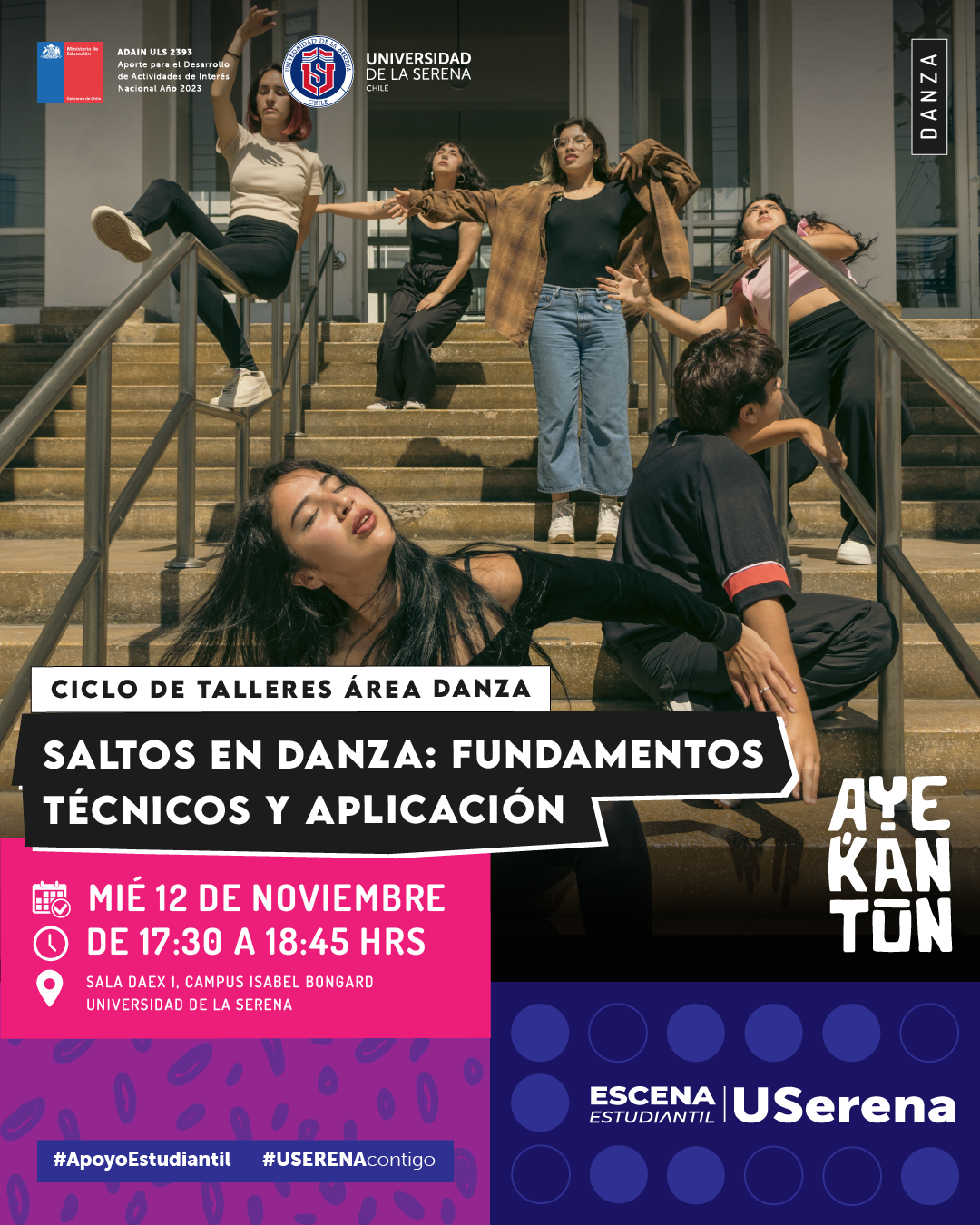 ✨💃 El Ciclo de Talleres del Área Danza continúa junto a Ayekantün, agrupación de danza contemporánea de la USerena 🌊. En esta sesión, titulada “Saltos en danza: fundamentos técnicos y aplicación”, exploraremos el impulso, la coordinación y la expresión corporal a través del movimiento en altura 💫